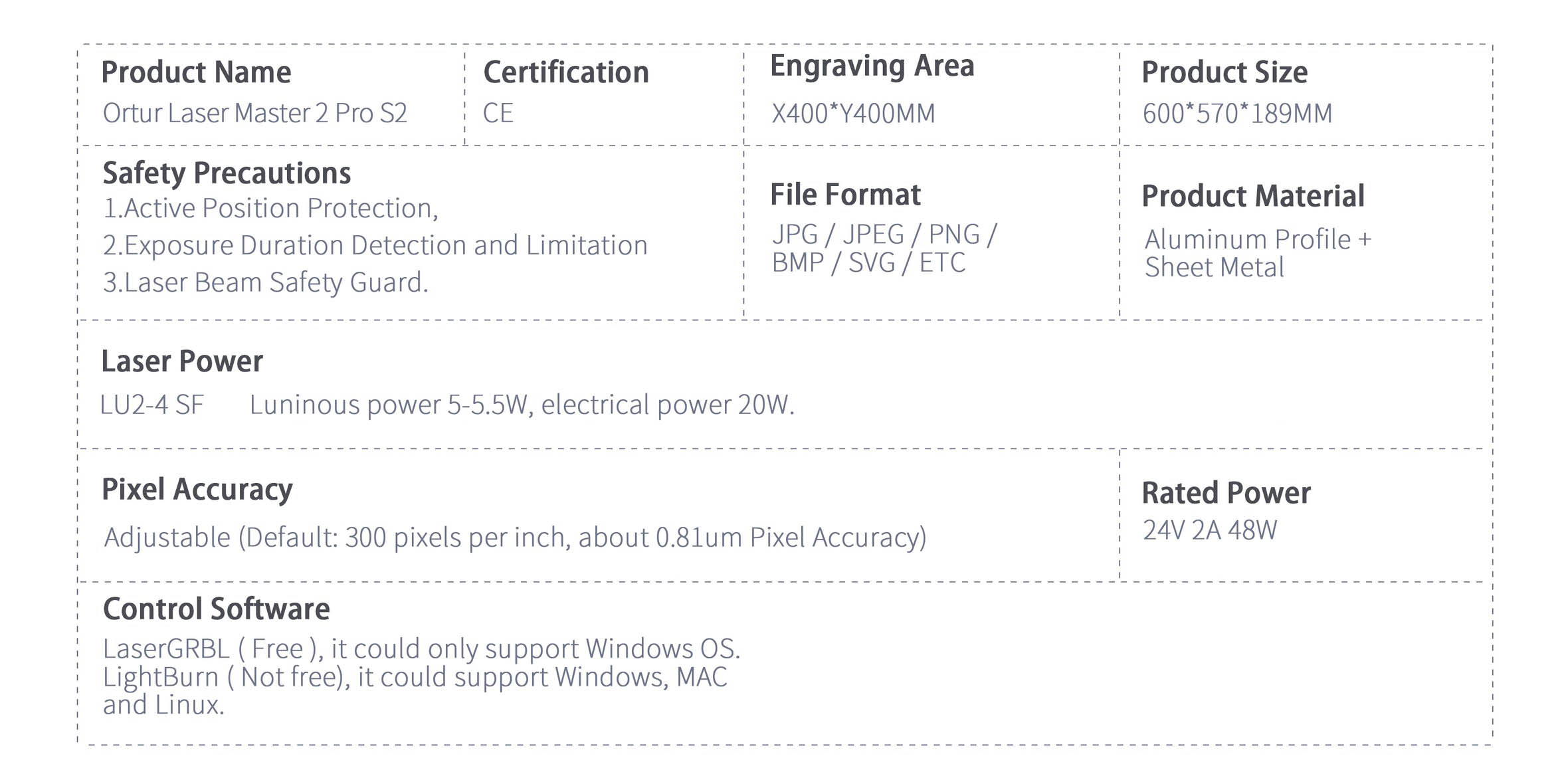 Gravorul laser Ortur poate fi compatibil cu diverse programe de gravură mature, cum ar fi LaserGRBL, LightBurn, suportă Win XP / Win 7 / Win 8 / Win 10 și, de asemenea, suportă sistemele MAC și Linux, formatul de fișier de gravură acceptă JPG, PNG, BMP, JPEG, SVG, ETC etc.