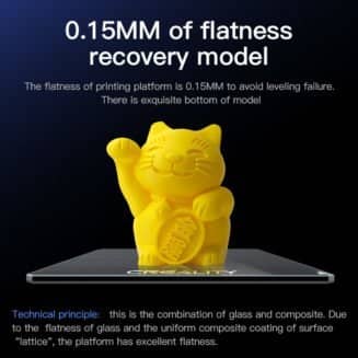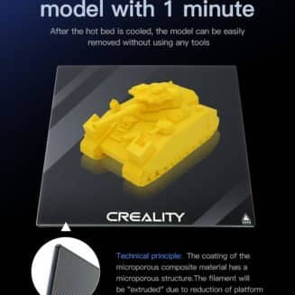 Platforma de imprimare CREALITY, din carborundum asigură o aderență excelentă pentru modelele imprimante, de orice dimenisuni. Rezistentă la temperaturi înalte, oferă încălzire uniformă și planietate excelență, pentru a face imprimarea ideală. Suportă materiale precum PLA, ABS, PC, Nylon, PP, PETG, TPU.